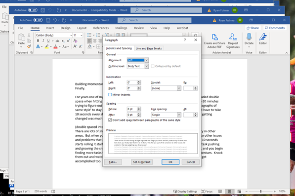 For years one of my biggest pet peeves while using Word to take notes has been the dreaded double space when hitting enter to go down to the next line. At times I’d look it up and spend 5-10 minutes trying to figure out how to get the check box in Paragraph ‘Don’t add space between paragraphs of same style’ to stay checked… but it never would. Ultimately I resigned to the fact that I’d have to take 10 seconds every sheet and make the adjustment… but the weight of that small task not getting changed was much heavier than the 10 seconds for every word doc..